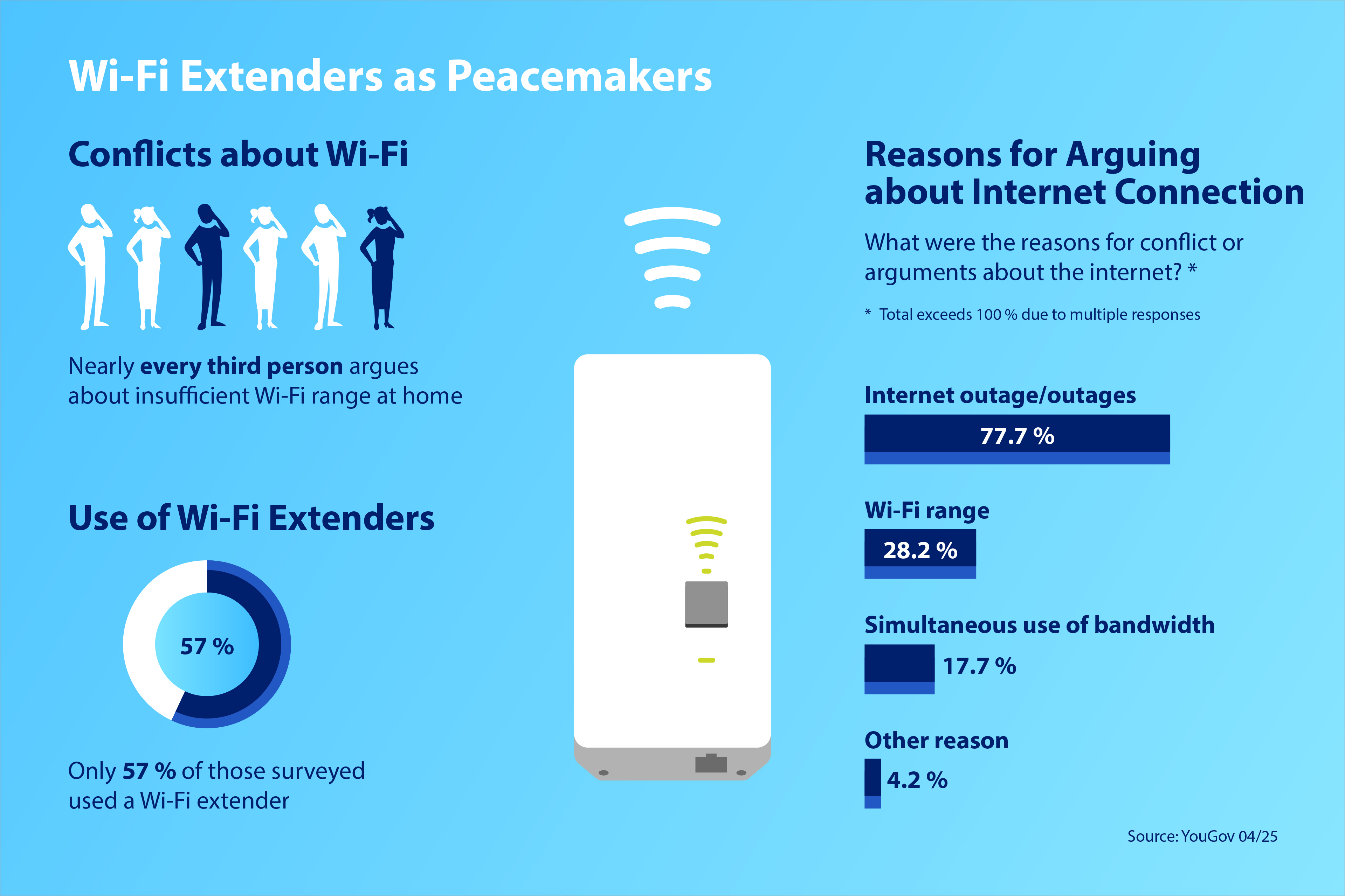 A survey recently performed by the market and opinion research institute YouGov analysed current internet use in Germany. The results suggest that peace in the digital home is closely linked to the use of Wi-Fi extenders. Over 3,000 participants were asked whether they regularly experience internet problems and whether they use Wi-Fi extenders.